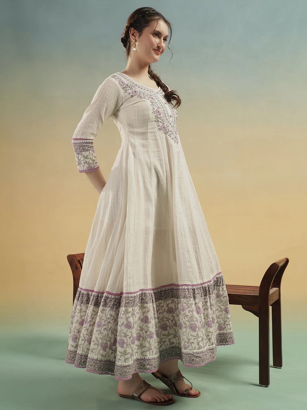 Women wearing ivory white embroidered cotton A-line dress with floral borderAakrati Vastram Ivory Bloom A-Line Cotton Dress