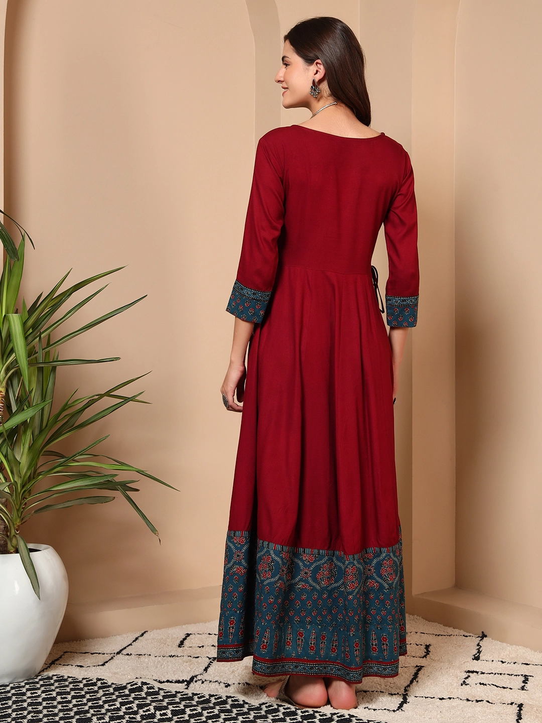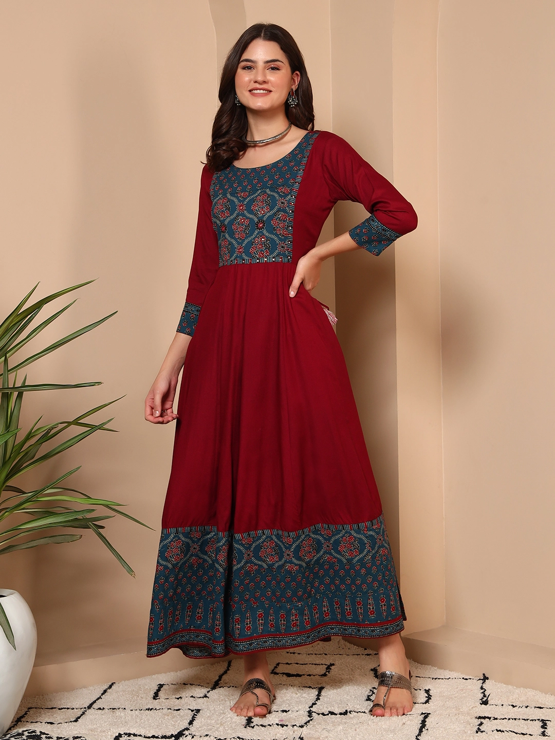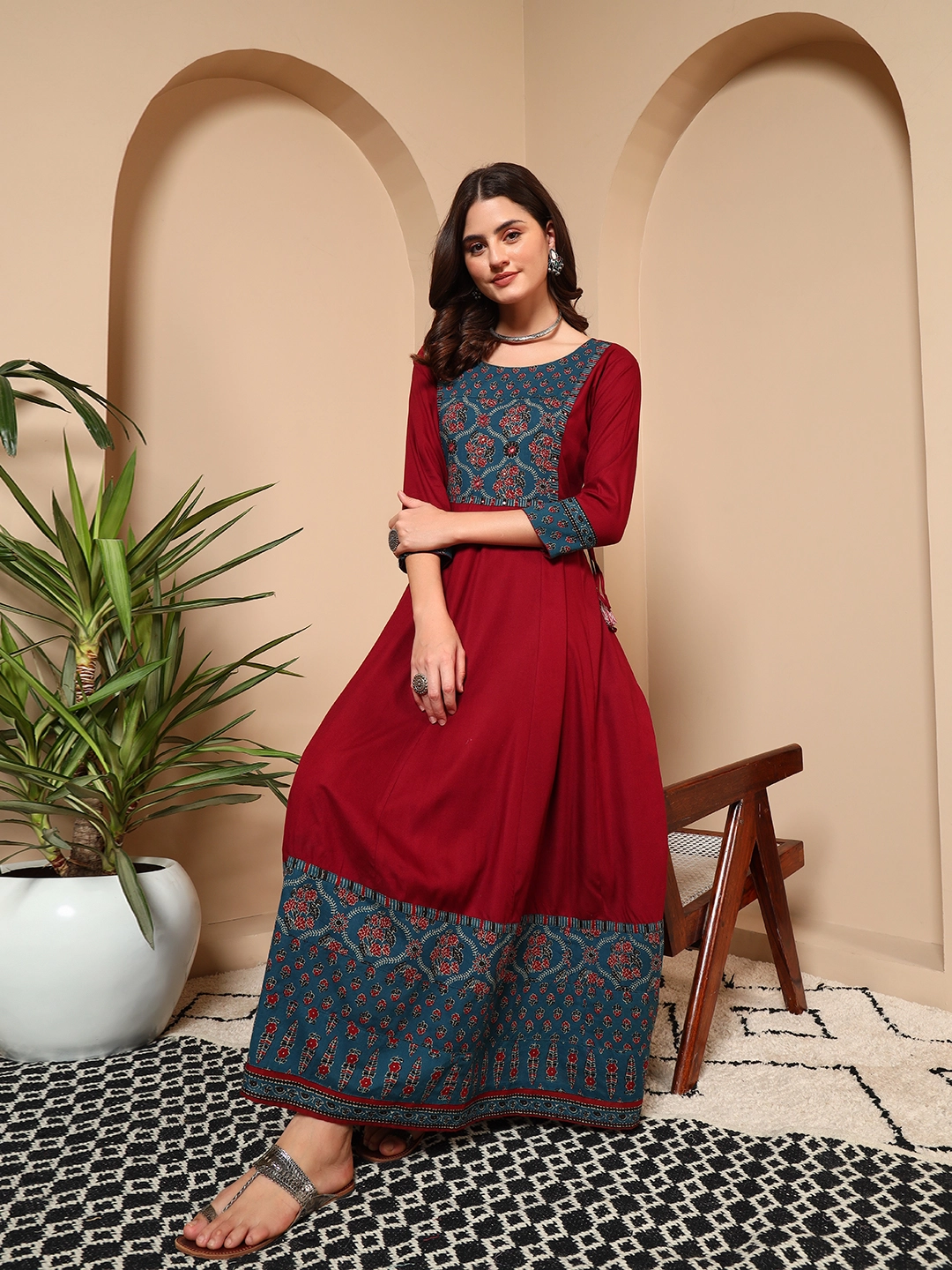 Woman wearing red cotton traditional handwork maxi dress for office and festive wearRiwaayat Red Cotton Handwork Maxi Dress